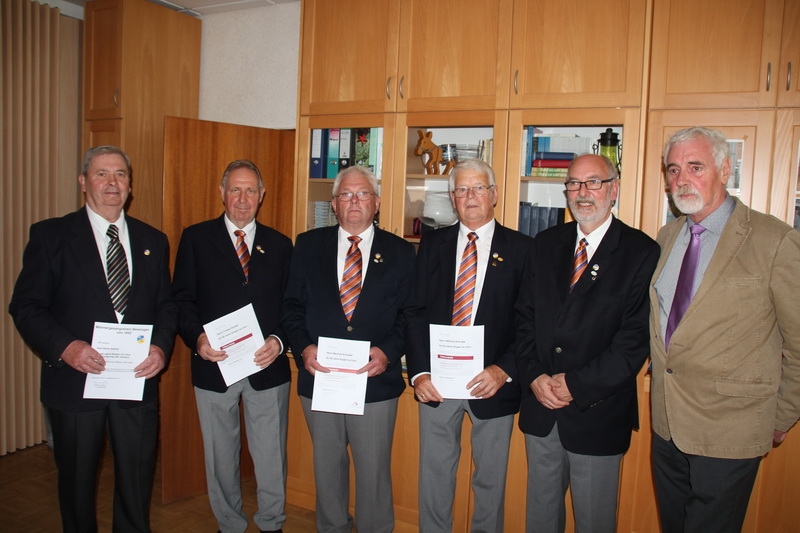 Es folgte die Ehrung langjähriger Mitglieder durch den Vorsitzenden der Chorregion West, Sangesbruder Gerd Fliege, aus Bad Pyrmont. Dieser ehrte mit Greve für 60 Jahre Mitgliedschaft und Singen im Chor die Sangesbrüder Wilfried Schnake und Karl-Heinz Kehne und für 50 Jahre die Sangesbrüder Manfred Schrader und Helmut Hartmann.