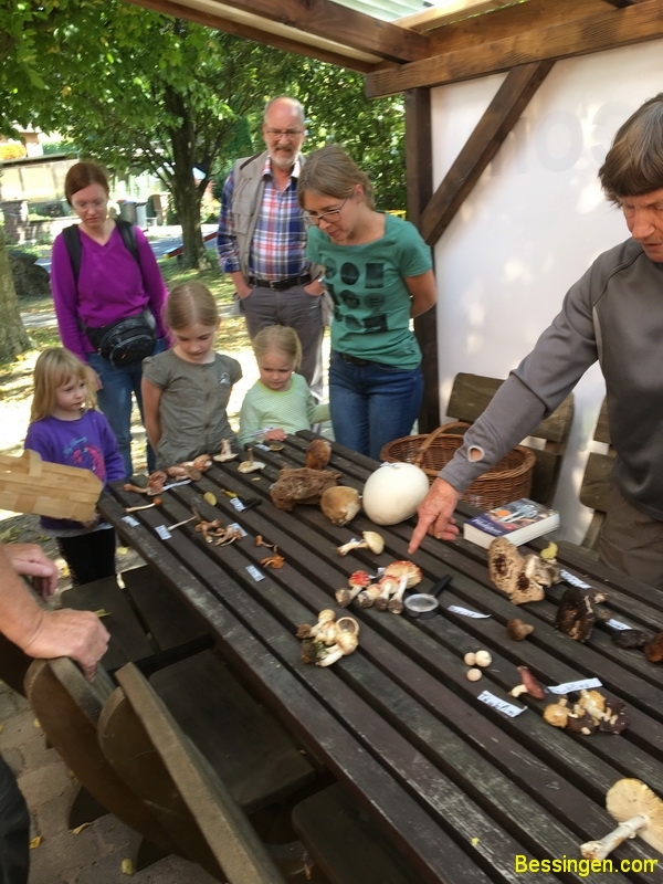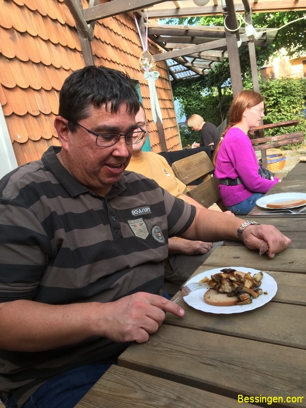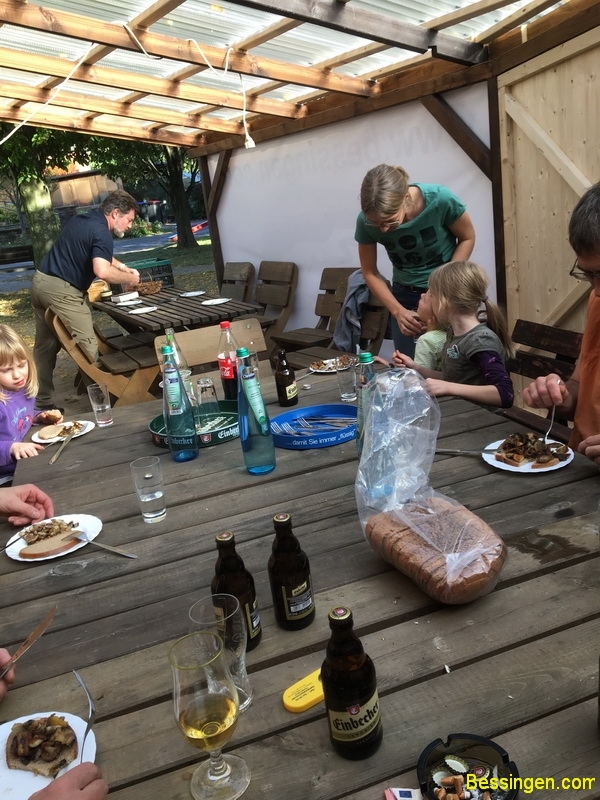 12 Erwachsene und 4 Kinder trafen sich erwartungsvoll am frisch errichteten Sommerpavillon und wurden zunächst von Iris informiert, welche Pilze zu verwenden und welche giftig sind. Ein getrockneter Bovist sprühte wie ein Vulkan dunkelgrüne „Lava“ aus. Zwar nicht so heiß aber schön anzusehen.