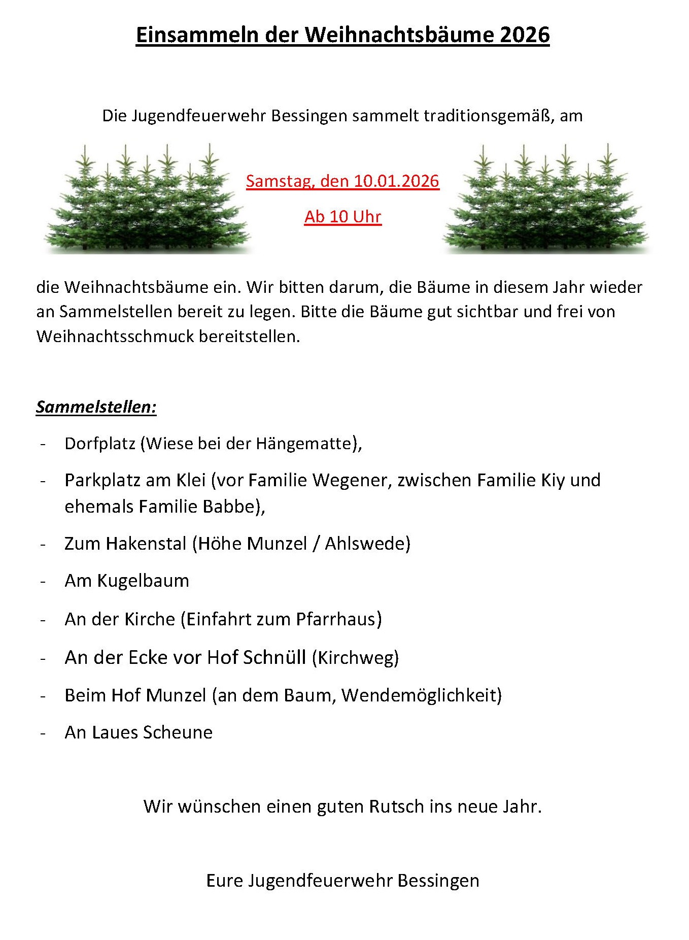 Tannenbäume einsammeln 2026 Beitrags-Autor:admin Beitrag veröffentlicht:29. Dezember 2025 Beitrags-Kategorie:Aktuell Beitrags-Kommentare:0 Kommentare Weihnachtsbaumeinsammeln in 2026 – kier klicken um pdf zu erhalten. Schlagwörter: tannebaum, Tannenbaum, Weihnachtsbaum Weitere Artikel ansehen Vorheriger BeitragEinladung zum Tannenbaum aufstellen 2025 Das könnte dir auch gefallen Gossensanierung Schwefelborn/Quellenweg 5. Oktober 2021 Unterseite der Kinderfeuerwehr online! 4. Februar 2019 Bericht „Wir waren zelten“ 2022 27. Juli 2022 Schreibe einen Kommentar Antwort abbrechenKommentarGib deinen Namen oder Benutzernamen zum Kommentieren ein Gib deine E-Mail-Adresse zum Kommentieren ein Gib deine Website-URL ein (optional) Δ Diese Website verwendet Akismet, um Spam zu reduzieren. Erfahre, wie deine Kommentardaten verarbeitet werden.